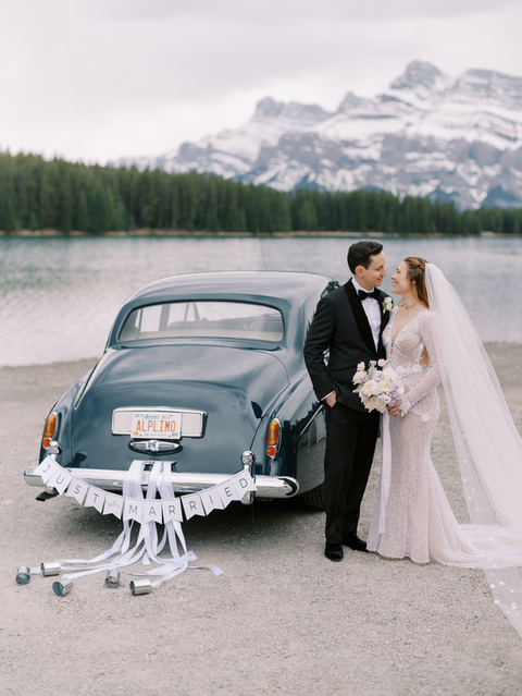 Their ceremony took place on the Victoria Terrace, framed by romantic florals and the iconic backdrop of the Rocky Mountains. The celebration continued indoors in Mount Stephen Hall, where the reception was styled with a thoughtful mix of centrepiece designs and greenery gently draped from the chandeliers above. The overall feeling was soft, light, refined, and natural, a spring garden wedding that felt timeless, effortless, and full of beauty.