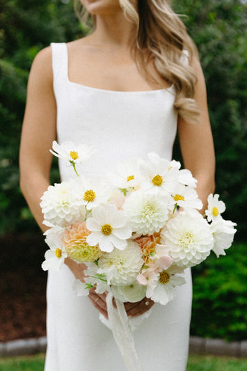 Their floral design embraced playful citrus tones and airy movement, featuring favourite seasonal blooms like cosmos, sweet peas, and dahlias. Laura’s flowers were colourful, whimsical, and full of personality, adding a cheerful, garden-inspired touch to the ceremony. From the morning bouquets to the laughter-filled reception, every detail felt lighthearted and full of love, perfectly reflecting Laura and Matt and the joy they share.